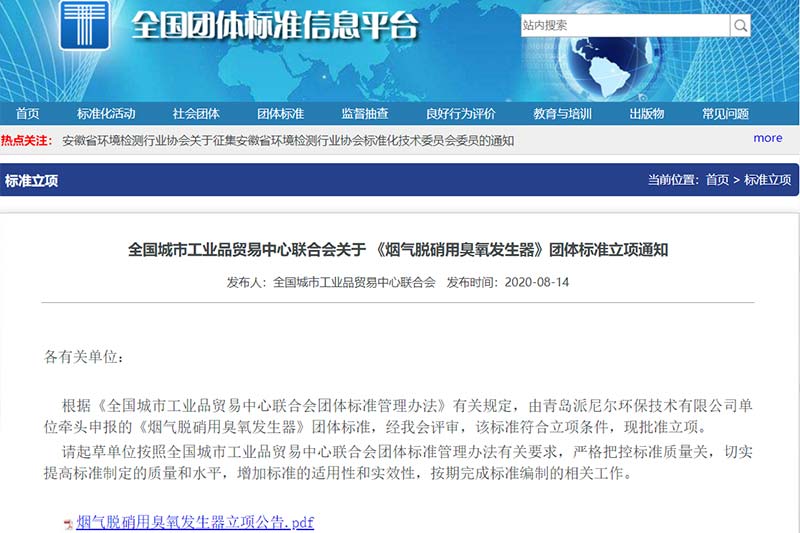 全國城市工業(yè)品貿(mào)易中心聯(lián)合會(huì)關(guān)于《煙氣脫硝用臭氧發(fā)生器》團(tuán)體標(biāo)準(zhǔn)立項(xiàng)通知
